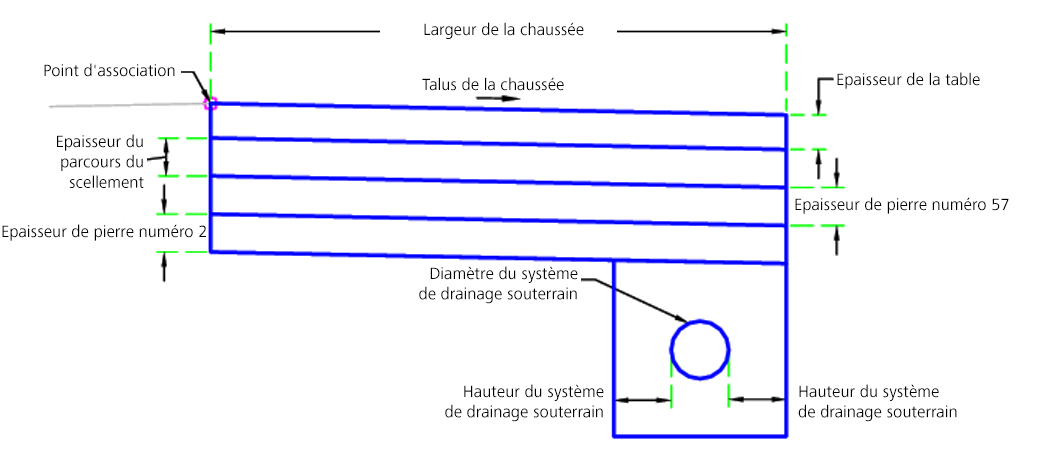 L'élément de profil type ChausséePerméable insère des liens et des formes pour créer une table avec un système de drainage souterrain optionnel.