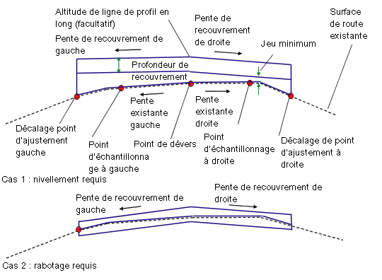 La pente de la surface existante sur chaque côté se détermine entre les points de dévers et les points d'échantillonnage. Les pentes des calques de recouvrement sont déterminées par les étapes suivantes :