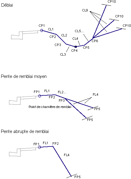 L'exemple de déblai du diagramme de l'élément de profil type indique l'emplacement de définition des cinq liens de déblai. Le point de test de déblai se situe sur le troisième lien. L'exemple de remblai donne deux liens de remblai définis.