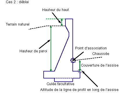 Cet élément de profil type peut être inséré sur les côtés droit ou gauche. Le point d'association est différent selon qu'il s'agit d'un remblai ou d'un déblai. Dans le cas d'un remblai, le point d'association est la ligne d'intersection entre la surface finale et la face intérieure de la paroi, en dessous du haut de la paroi, à une distance égale au paramètre Hauteur du haut. Dans le cas d'un déblai, le point d'association est la ligne d'intersection entre la surface finale et la face intérieure, au-dessus du haut de l'assise, à une distance égale au paramètre Couverture de l'assise. La hauteur de la paroi est déterminée à partir des paramètres Profil ou Hauteur de paroi spécifiés.