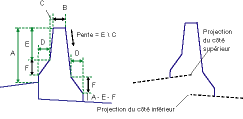 Les pentes de droite et de gauche sont calculées entre les points d'échantillonnage sur chaque côté. Les lignes qui partent des points de découpe sont prolongées vers l'intérieur sur ces pentes vers la ligne d'axe. Le côté dont l'altitude est la plus élevée sur la ligne d'axe, détermine le côté gérant la hauteur minimum du séparateur.