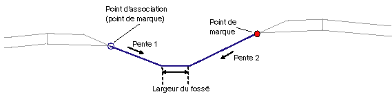 Les emplacements du point d'association et du point marqué sont déterminés. Le point marqué peut être situé à droite ou à gauche du point d'association. Les liens se prolongent vers l'intérieur depuis le point d'association sur Pente 1 et à partir du point marqué sur Pente 2 jusqu'à leur intersection. Si la largeur du fossé est non nulle, un lien horizontal est utilisé pour le fond du fossé afin de s'ajuster à l'intersection des pentes du talus.
