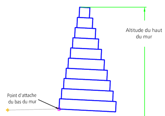 | Altitude du haut du mur | Permet de définir l'altitude du haut du mur lorsque le point d'association est défini sur la base du mur. Les types d'objet suivants peuvent être utilisés comme cibles pour indiquer l'altitude : lignes de profil, polylignes 3D, lignes caractéristiques du terrain ou figures de topographie. | Option requise lorsque le point d'association est défini sur la base du mur |