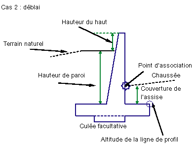 Le point d'association est différent selon que le mur de soutènement est en remblai ou en déblai. S'il est en remblai, le point d'association se situe près du haut du mur de soutènement. S'il est en déblai, le point d'association se situe près de l'assise.