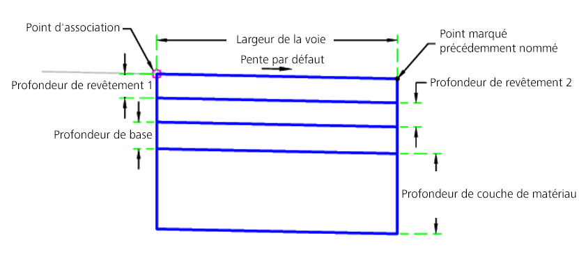 L'élément de profil type VoieAvecPointMarqué crée une représentation de profils en travers d'une voie de circulation avec une voie pour créer un lien qui va du point d'association à un autre point marqué et nommé.