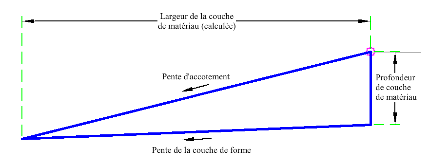 L'élément de profil type ShoulderIntersectLeft crée un accotement prolongé jusqu'à un point d'entrée en terre selon la pente de l'accotement et la couche de matériau. Il ne fonctionne que sur la gauche.