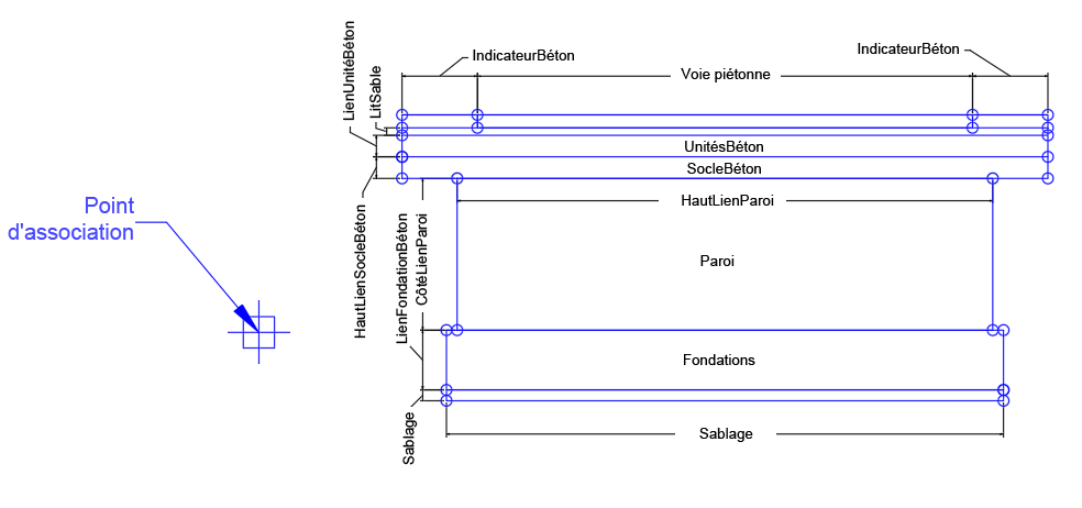 L'élément de profil type Quai_Double inclut des couches courantes pour un quai double telles que les parois, les socles en béton, les voies piétonnes, les lits de sable et les fondations.