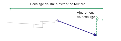 Valeur +/- ajoutée au décalage de la limite d'emprise routière. Une valeur d'ajustement négative déplace le point d'entrée en terre à l'intérieur de la limite d'emprise routière. Une valeur positive le déplace à l'extérieur de cette limite. |