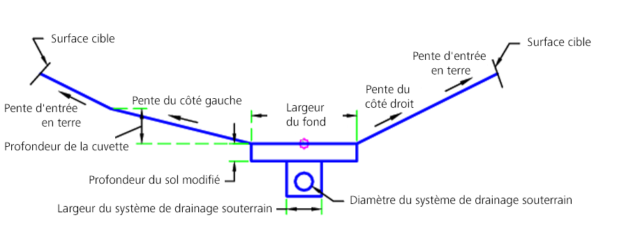 En commençant au point d'association, la cuvette est créée à l'aide des paramètres d'entrée. Si la cible de surface est définie, la surface d'entrée en terre est détectée (uniquement en cas de déblai). Si l'option Inclure un système de drainage souterrain est définie sur Oui, le système de drainage souterrain est construit.
