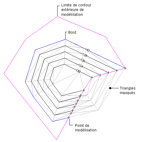 Les limites de contour sont des polylignes fermées qui affectent la visibilité des triangles à l'intérieur ou à l'extérieur des polylignes. La limite de contour extérieure détermine l'étendue de la surface. Tous les triangles situés à l'intérieur de la limite de contour sont visibles et les triangles situés à l'extérieur sont invisibles.
