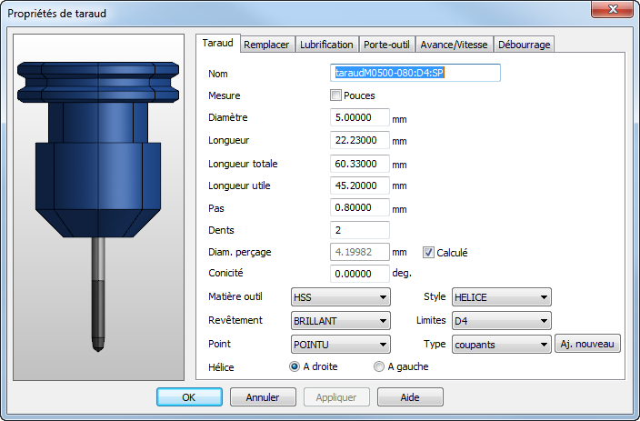Si aucun diamètre de perçage n'est défini pour les types de taraudage helicoil ou perso, alors le formule du taraud est utilisée pour calculer le diamètre de perçage.