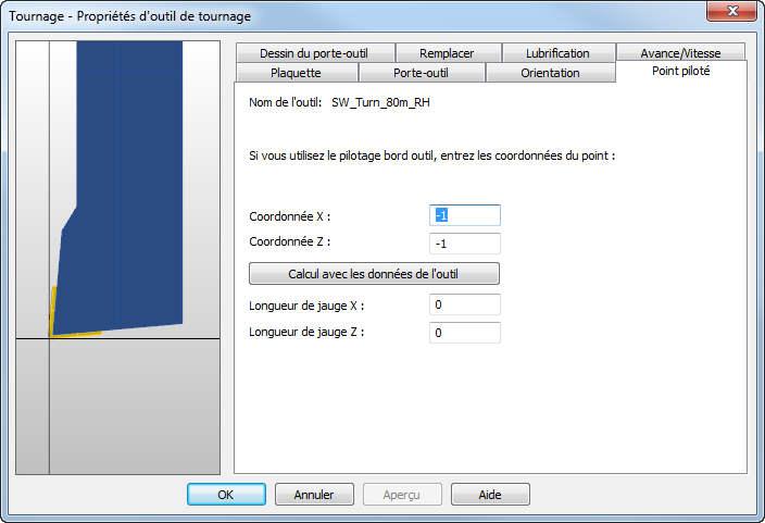Dans l'onglet Point piloté (point de programme), vous définissez le point de la plaquette qui est programmé. Vous pouvez définir les la coordonné X et la coordonnée Z.