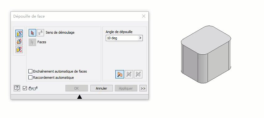 Comment utiliser l’enchaînement automatique des faces et du raccordement automatique avec la dépouille de face