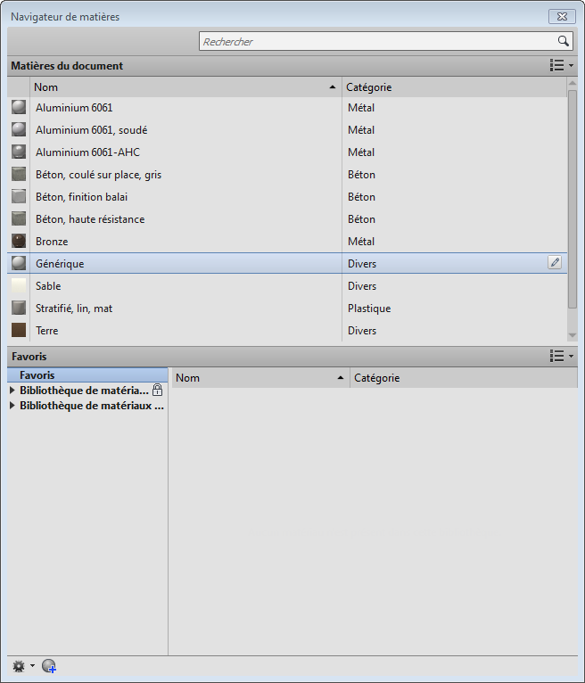 • Repérez la commande matière dans le ruban sous l'onglet Outils du groupe de fonctions Matières et apparences. Vous pouvez également accéder à la commande Matière dans la barre d'outils d'accès rapide. Cliquez sur la commande Matière pour ouvrir le navigateur correspondant, reportez-vous à l'illustration 1.