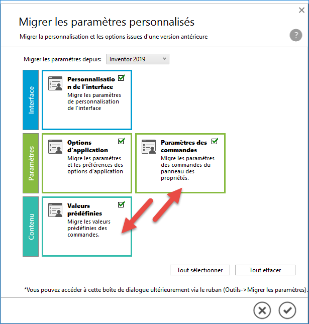 Lors de l'installation d'une nouvelle version d'Inventor, vous pouvez migrer des paramètres depuis une version antérieure. Sélectionnez les groupes de paramètres à migrer.