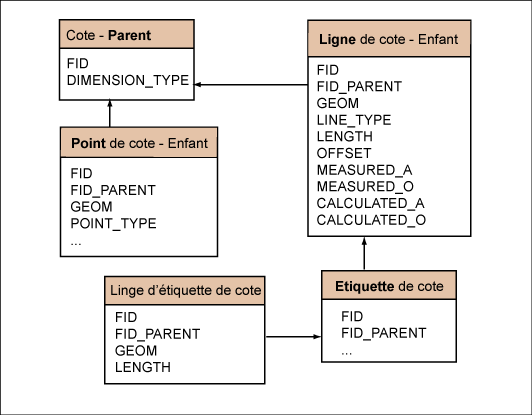 Des classes d'objets spéciales permettant de stocker la cotation dans la base de données sont disponibles. Une cotation comprend plusieurs classes d'objets associées. Une classe d'objets cotation (classe d'objets attribut principale) est associée à plusieurs classes d'objets enfant qui servent à stocker les composants géométriques, comme les points (symboles), les lignes et les étiquettes.