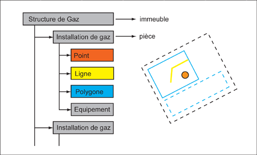 Une structure Gaz peut correspondre à un immeuble constitué de pièces (installations) qui contiennent des équipements tels que des bureaux et des chaises. L'installation est associée à une géométrie. Structure et équipement sont des classes d'objets attribut.