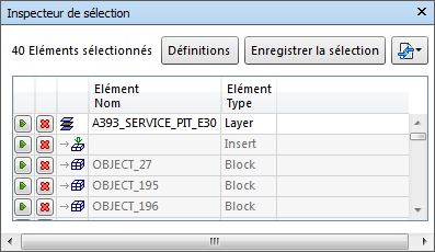 Tous les objets qui sont visibles dans la fenêtre Inspecteur de sélection peuvent être exportés vers un fichier CSV. Vous devez désélectionner les objets si vous souhaitez les exclure du fichier exporté.