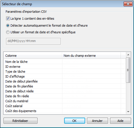 Boîte de dialogue Sélecteur de champ destinée à importer les données CSV.