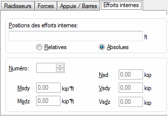 Afin de définir un nouveau cas de charge, il faut sélectionner l'option Manuelles qui se trouve dans le champ Charges. A partir de ce moment, vous pouvez saisir les forces quelconques, définir les raidisseurs dans les points voulus et déterminer les efforts internes conformément à la charge définie. Les valeurs des efforts internes doivent être indiquées dans l'onglet Efforts internes.
