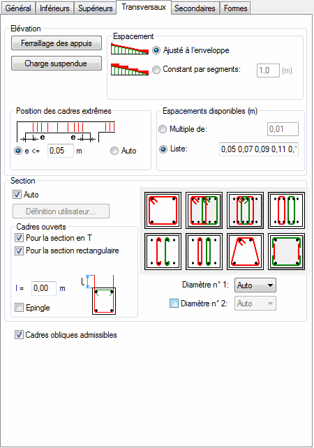 Après la sélection de la commande Disposition d'armature et de l’onglet Armatures transversales, la boîte de dialogue présentée ci-dessous s'affiche.