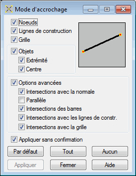 Les options en question permettent d’accrocher le pointeur dans les points d’intersection des barres et des normales. Une option utile est la possibilité de définir les lignes horizontales et verticales et de rechercher leurs intersections avec les barres ou lignes de construction. Les modes suivants sont accessibles :