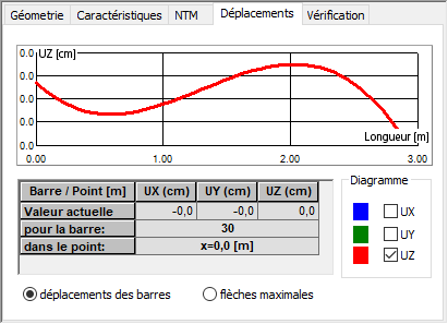 Si vous avez sélectionné l'option Déplacements des barres, Robot présente les valeurs des déplacements globaux UX, UY, UZ dans le point aux coordonnées indiquées sur la barre. Si vous cliquez dans le champ Dans le point et déplacez la souris vers le diagramme dans la partie supérieure de la boîte de dialogue, le logiciel affiche une ligne verticale permettant de définir les valeurs des coordonnées pour lesquelles les valeurs seront présentées.