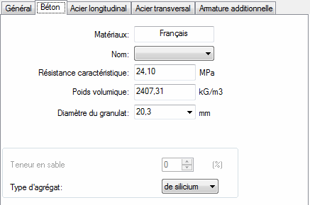Dans cet onglet vous pouvez définir les paramètres du béton utilisé pour les calculs d'un élément BA de la structure.