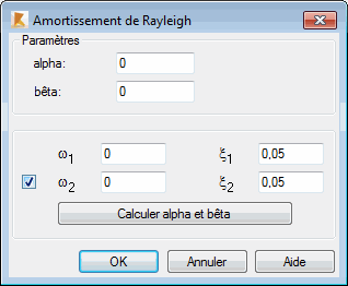 La matrice de l'amortissement C est calculée en tant que combinaison de la matrice de rigidité K et de la matrice des masses M avec prise en compte des paramètres énumérés :