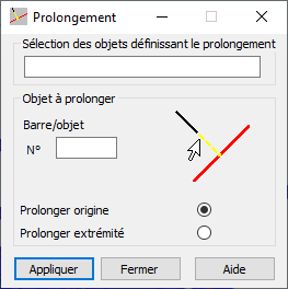 Cette option sert à prolonger les barres/objets sélectionnés vers les barres ou objets définissant le prolongement. Ouvrez la boîte de dialogue Prolongement avec l'une des deux méthodes suivantes :