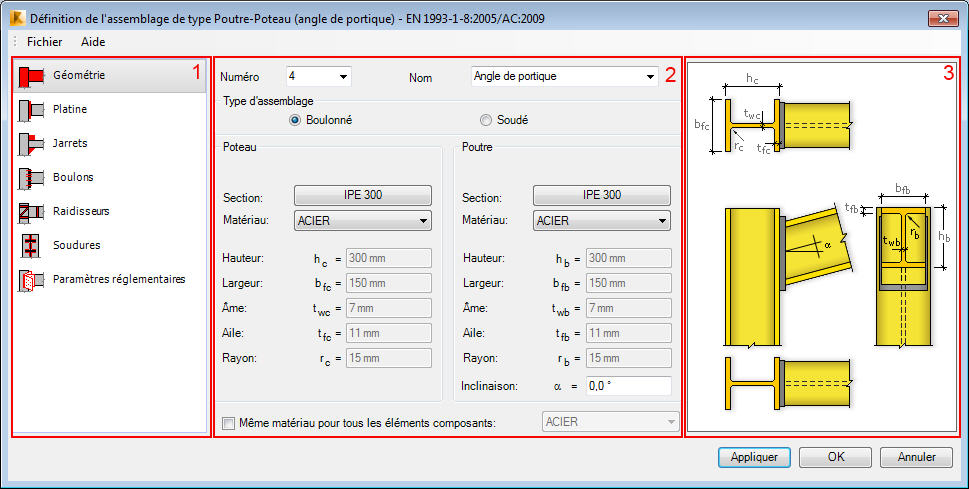 3. La partie droite contient la vue graphique de l'élément de l'assemblage poutre-poteau défini.