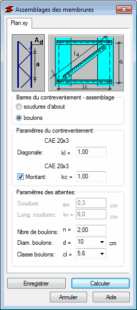 La vérification de l’assemblage des éléments du contreventement avec le fût du poteau est effectuée de façon simplifiée. En cas d’assemblage par soudures d’angle, le logiciel demande la longueur totale des soudures unissant les contreventements et le fût, le logiciel admet que le centre de gravité du système de soudures est colinéaire avec l’axe de la barre (le système travaille seulement en cisaillement, les excentrements éventuels ne sont pas pris en compte). En cas d’assemblage par boulons, on admet également la colinéarité de l’axe de la section et de l’axe de la position des boulons. Par conséquent, la capacité de charge de cet assemblage est la somme des résistances de tous les boulons formant l’assemblage.