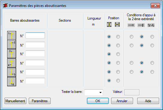 Pour définir les paramètres des barres aboutissantes pour le calcul du coefficient de flambement de la barre principale, double-cliquez sur dans la boîte de dialogue Conditions de flambement.