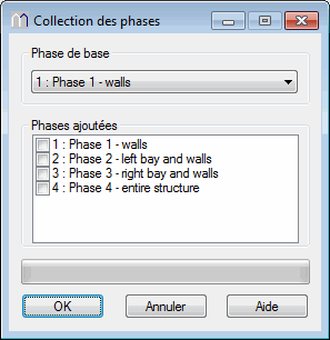 L’option Collectionner phases est utilisée pour définir les résultats de la phase sélectionnée (phase initiale) suivant la phase finale (phase de base) sélectionnée qui, par défaut, doit être la structure entière. L’option en question entraîne la collection des phases sélectionnées (collection des résultats) et permet de comparer les phases sélectionnées en mode graphique. Dans la partie supérieure de la boîte de dialogue, vous devez sélectionner la Phase de base. Pour définir les Phases ajoutées, cochez la case correspondant à la base sélectionnée. Chaque phase peut être facilement ajoutée à la liste ou supprimée, pour cela, cliquez sur le bouton approprié.