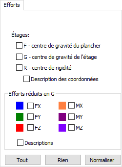 Dans cette boîte de dialogue, vous pouvez sélectionner les efforts réduits (FX, FY, FZ, MX, MY, MZ) pour les présenter ; les efforts et les moments sont réduits au centre de gravité de chaque étage pour un cas donné. Pour chacune des valeurs indiquées ci-dessus, la couleur et la description appropriées peuvent être sélectionnées.