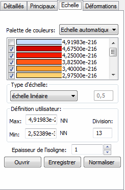 - Sélectionnez le type d’échelle (linéaire, logarithmique, arbitraire - définie par l’utilisateur). Si le type d'échelle arbitraire est sélectionné, vous pouvez éditer la valeur affectée à la couleur en double-cliquant dans le champ contenant la valeur affectée à la couleur donnée et en la modifiant.