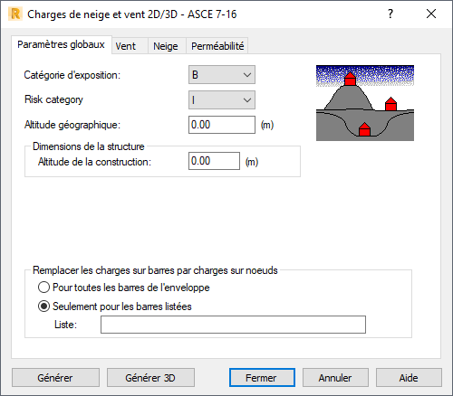 Ouvrir la boîte de dialogue Charge de neige et vent et cliquer sur l’onglet Paramètres généraux affiche la boîte de dialogue suivante :