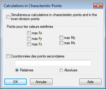 Si l'option Calculs simultanés dans les points caractéristiques et dans les points de division égale est activée, les calculs des barres de la structure seront alors effectués pour les points caractéristiques définis (déterminés dans cette boîte de dialogue) et pour le nombre de points de calcul défini dans la boîte de dialogue Configuration (option Nombre de points).