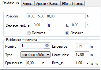 Après le lancement de l'analyse détaillée, les raidisseurs sont saisis automatiquement dans les positions suivantes sur la barre :