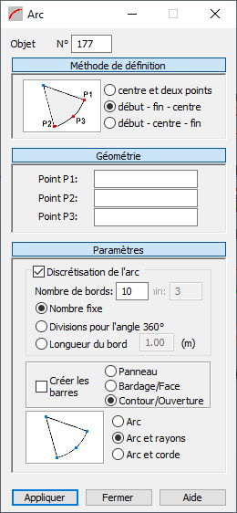 Quand la boîte de dialogue Arc est affichée sous sa forme maximale, cliquer sur l'un des boutons (Méthode de définition, Géométrie ou Paramètres) provoque la réduction de la boîte de dialogue à la zone correspondant au bouton. Seules les options en cours de définition s'affichent. Dans sa forme réduite, un clic sur un des boutons rétablit la partie correspondante de la boîte de dialogue.
