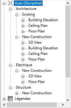 Par exemple, l'image suivante affiche des vues de l'arborescence du projet organisées par discipline, puis par phase et par type de vue.