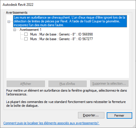 Développez la liste pour consulter les éléments associés à chaque avertissement. Lorsque vous sélectionnez le texte situé en regard d'un avertissement, l'élément est mis en surbrillance dans toutes les vues ouvertes où il est visible.