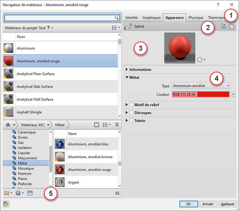 | 4 | Groupe de fonctions Propriétés : permet d'afficher et de gérer des propriétés détaillées de la ressource détaillée. Le nom et la description de la ressource sont affichés dans le groupe de fonctions déroulant Informations. L'exemple ci-dessus illustre les propriétés Métal affichées (développées) pour la ressource Apparence Anodisé - Rouge. L'ensemble de propriétés affichées pour un liquide, par exemple, varie en fonction de l'ensemble de propriétés affichées pour le métal. |