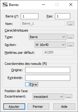 Vous pouvez définir des barres pour un portique 2D à partir de la boîte de dialogue Barres.