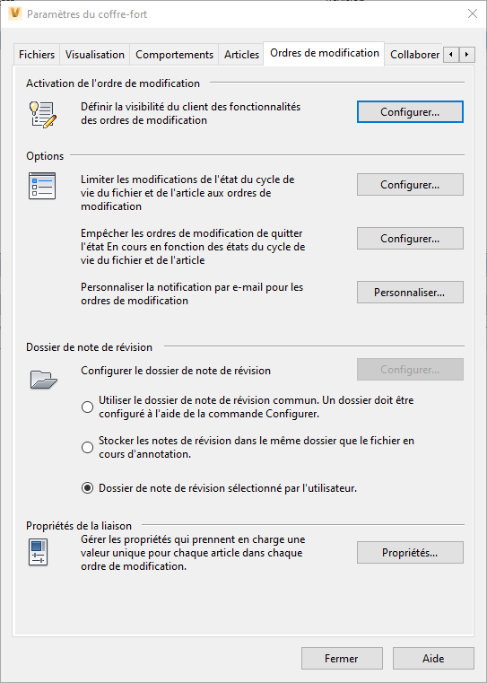 L'onglet Ordres de modification de la boîte de dialogue Paramètres du coffre-fort permet de configurer le comportement des différents ordres de modification.