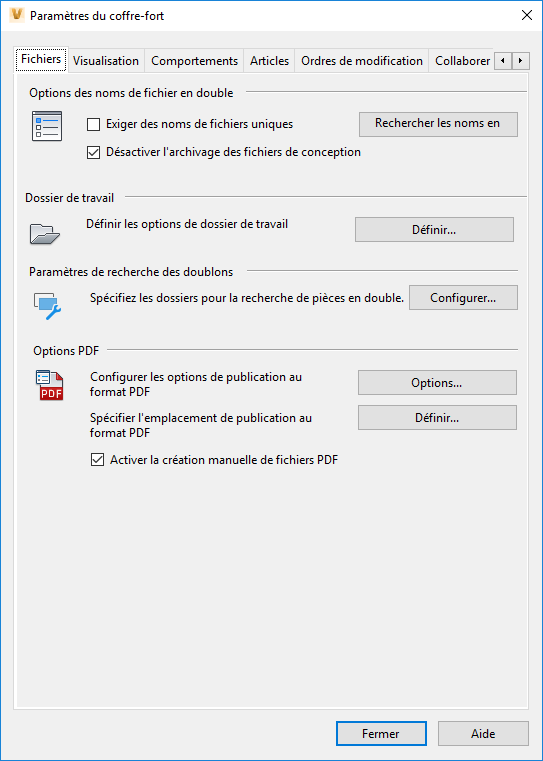 L'onglet Fichiers de la boîte de dialogue Paramètres du coffre-fort contient les options d'application de noms de fichier uniques, de désactivation de l'archivage de fichiers de conception, de spécification d'options de dossier de travail et de recherche de doublons.