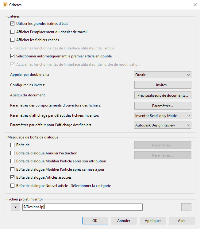 - Paramètres d'affichage par défaut des fichiers Inventor