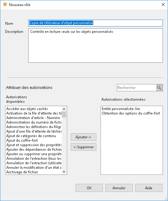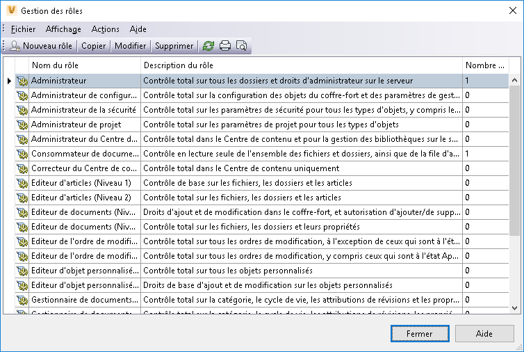 La boîte de dialogue relative aux autorisations de rôles s'intitule désormais Gestion des rôles. Elle vous permet de créer, modifier, copier et supprimer des rôles personnalisés. La boîte de dialogue contient désormais les descriptions des rôles, ce qui facilite leur gestion.