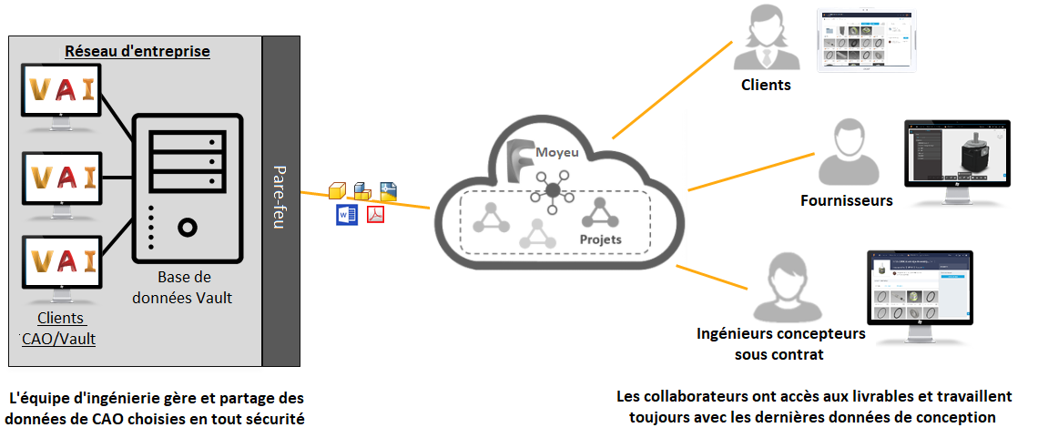 Les entreprises doivent collaborer sur des documents de CAO avec des consultants externes, des clients et des fournisseurs. Le partage des fichiers et la collaboration sur ces derniers s'effectuent souvent par l'intermédiaire d'un pare-feu d'entreprise. Il est essentiel de s'assurer que les fichiers corrects sont mis à disposition au bon moment et qu'ils peuvent être facilement échangés, quel que soit leur nombre ou leur taille.
