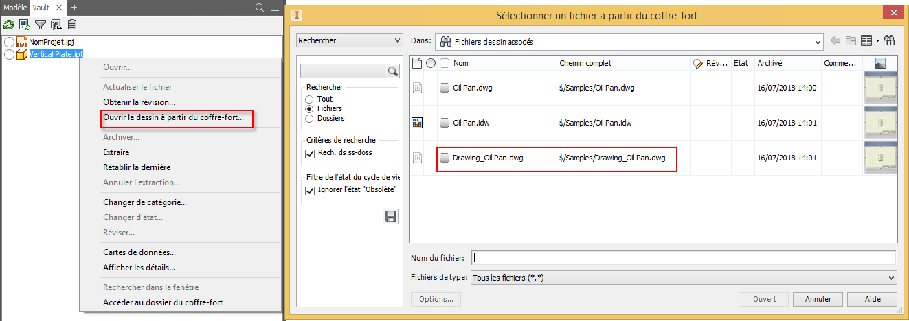 Vous pouvez ouvrir les dessins associés portant des noms différents et provenant de dossiers autres que le dossier du fichier source.